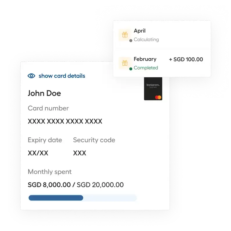 Spend SGD 100 using the Instarem Business Card and get SGD 50 back as a welcome bonus. Plus, enjoy an extra 5% cashback when you spend SGD 10,000 or more between 1 Feb and 30 April, 2026.